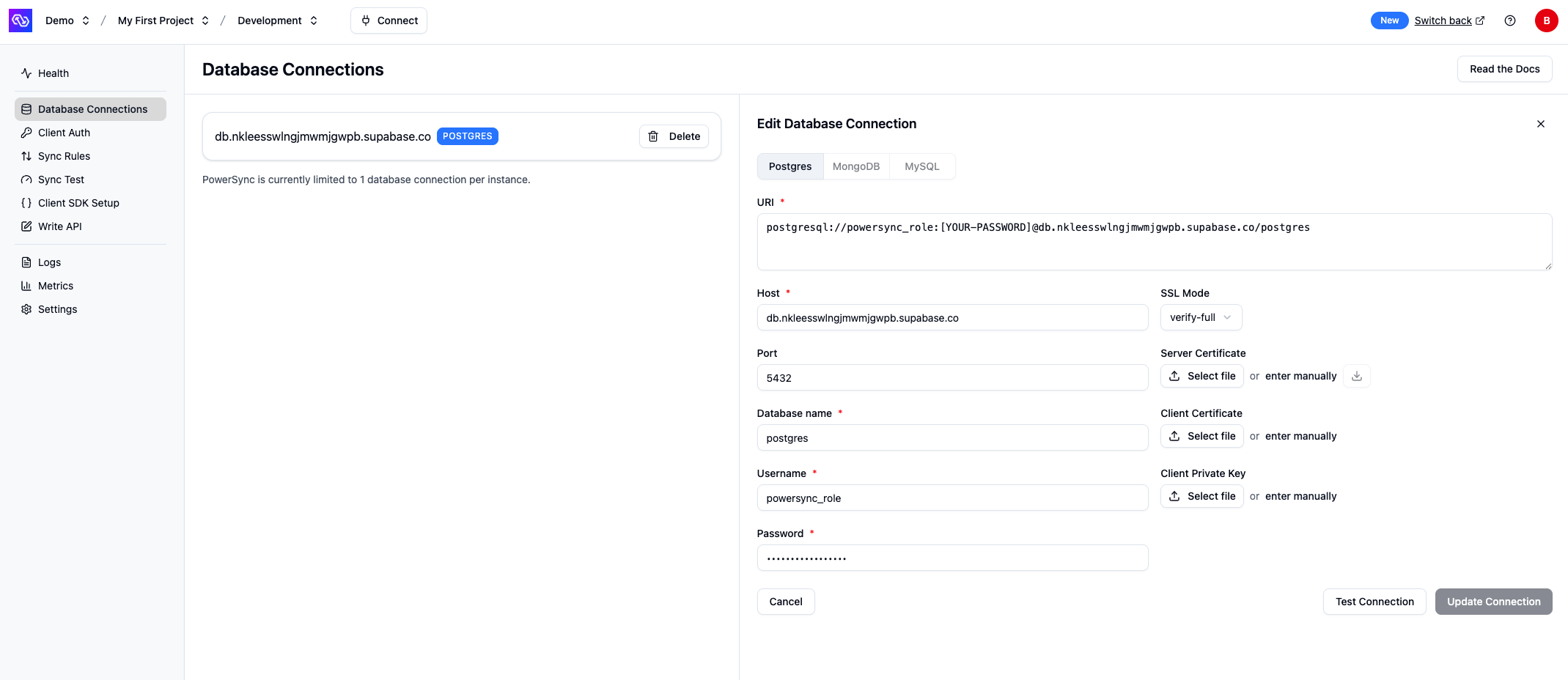 powersync_roleand password you created when configuring your Supabase for PowerSync (see Source Database Setup). -