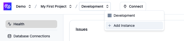 When creating a project in the PowerSync Dashboard, a Development and Production instance will be created by default. Select the instance you want to configure. If you need to create a new instance, follow the steps below.- In the dashboard, select your project and open the instance selection dropdown. Click Add Instance.