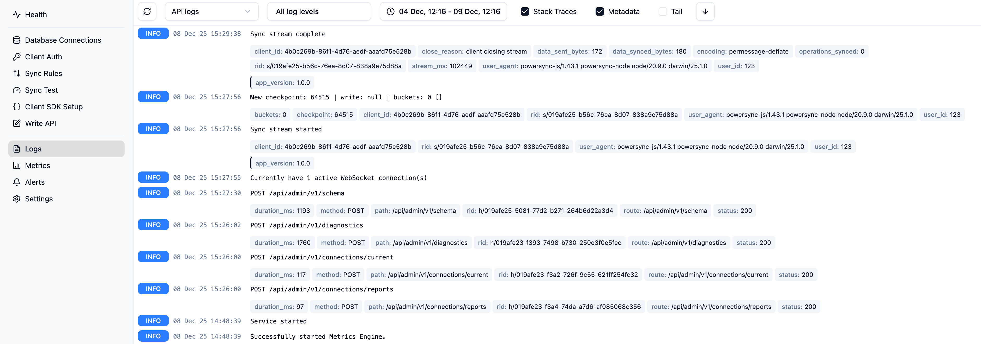 You can review logs for your PowerSync instance(s) to troubleshoot replication or sync service issues. Logs capture activity from the PowerSync Service and Replicator processes.- Service/API logs: Reflect sync processes from the PowerSync Service to clients.