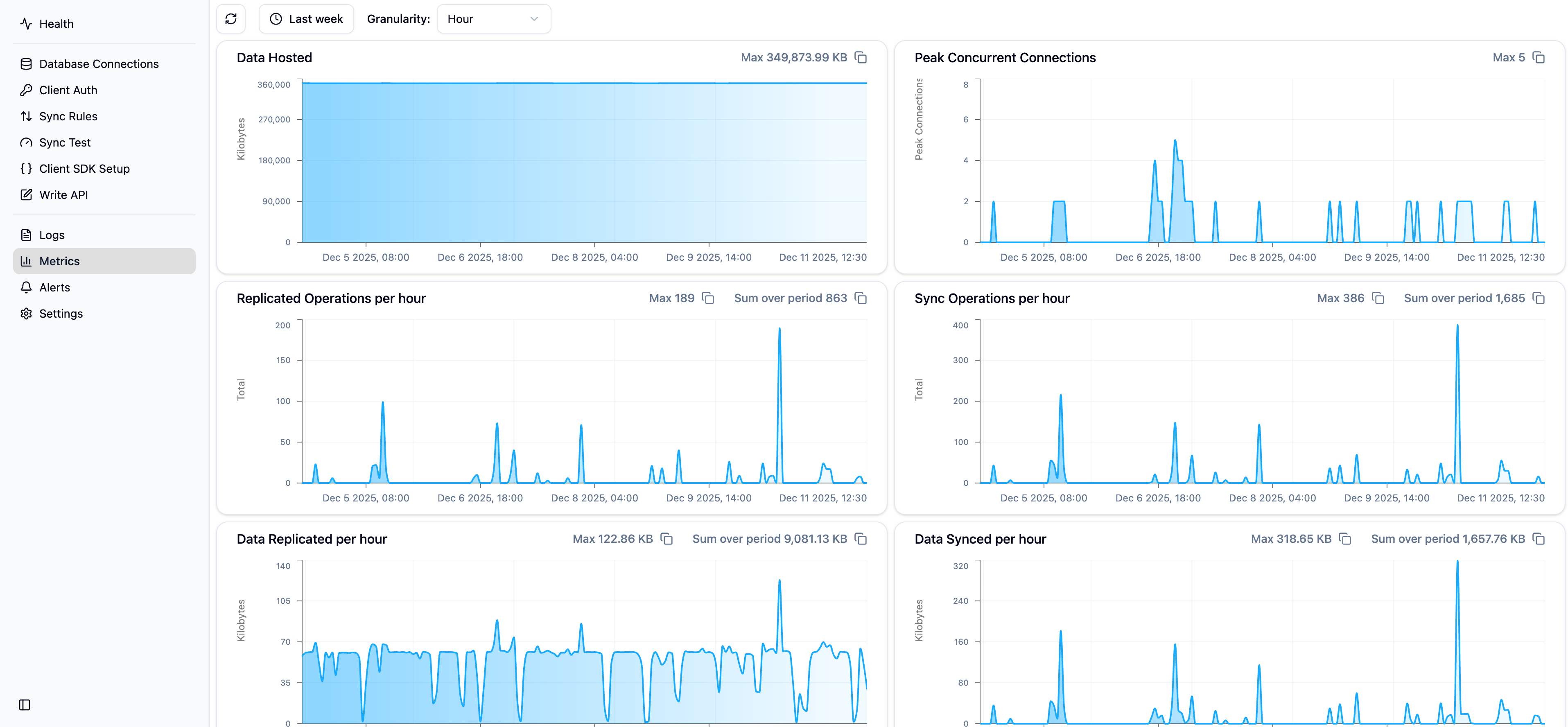 View time-series and aggregated usage data for your PowerSync instance(s), including storage size, concurrent connections, and synced data and operations. This data lets you monitor activity, spot patterns or spikes, and budget while tracking your position within our Cloud pricing plans.View Usage Metrics