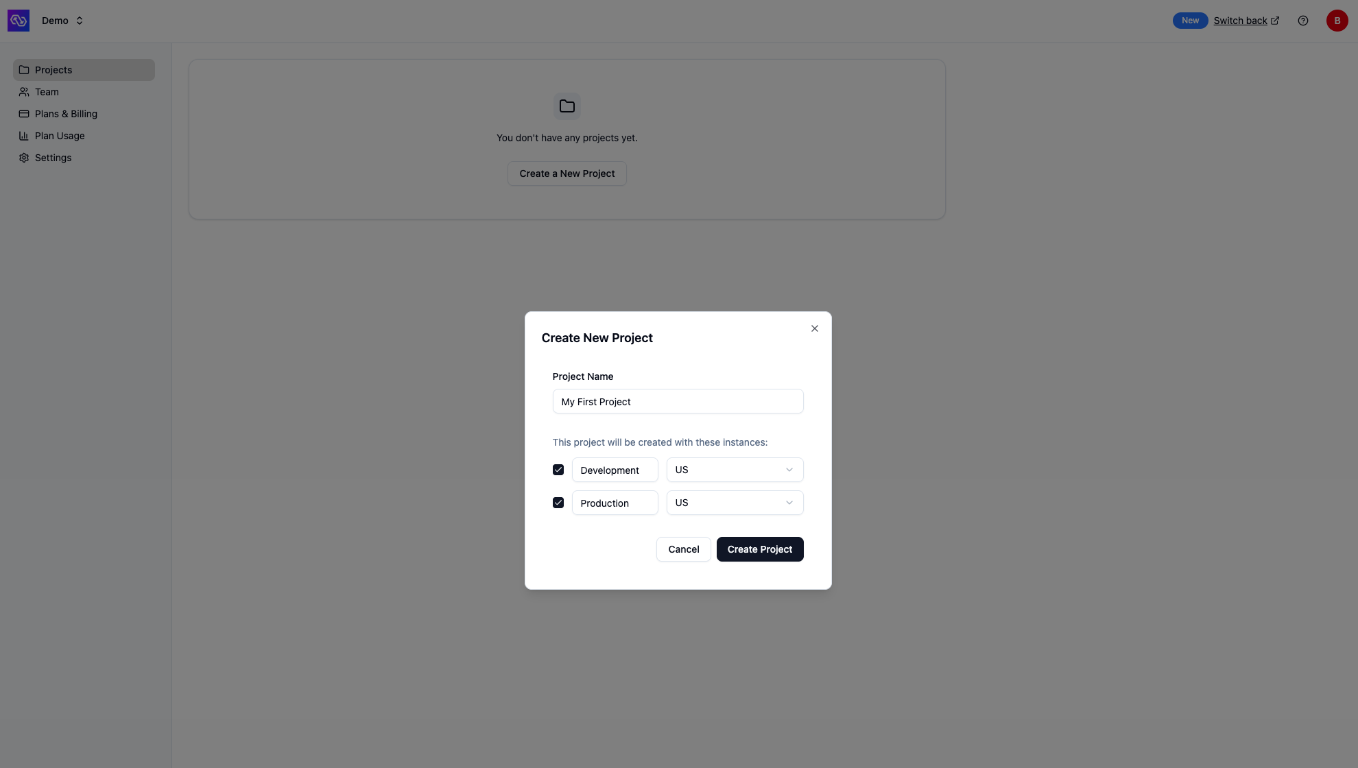 - Projects - View all projects in your organization, create new projects, and manage project settings